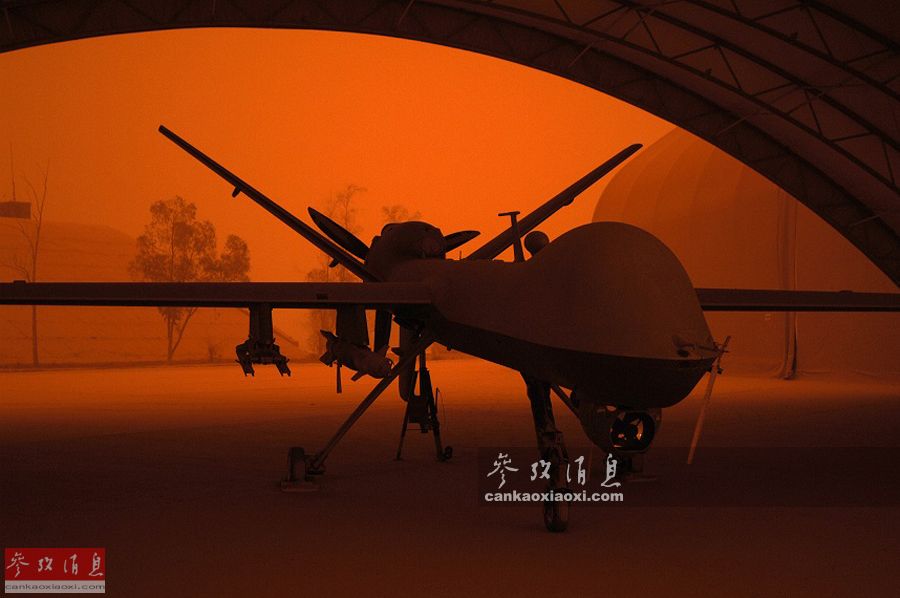 图为在沙暴期间拍摄的停放在机库中的MQ-9攻击型无人机。