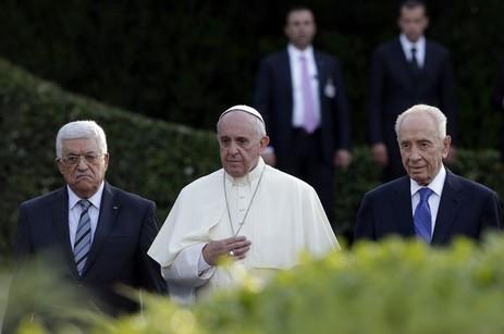 2014年6月8日,罗马教皇方济各(中)、以色列总统佩雷斯(右)和巴勒斯坦总统阿巴斯相约在梵蒂冈教廷花园共同为世界祈祷和平。 路透社资料图