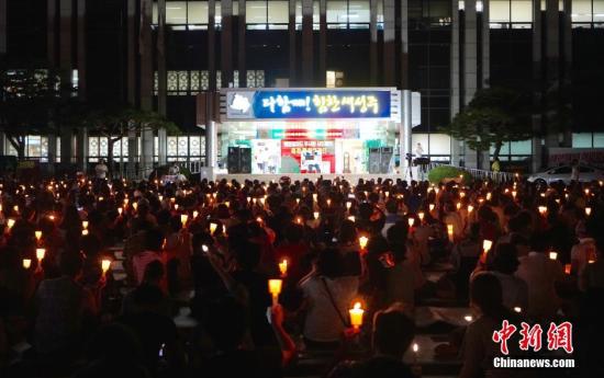 7月31日,美韩当局公布的“萨德”反导系统部署地——韩国庆尚北道星州郡当地的示威活动已经进入第20天。每天都有上千名头戴“反对‘萨德’”字样头巾、高举“不要‘萨德’要和平”、“美军离开韩国”等标语的抗议者在郡政府前点燃烛火示威,祈愿和平。 中新社记者吴旭摄