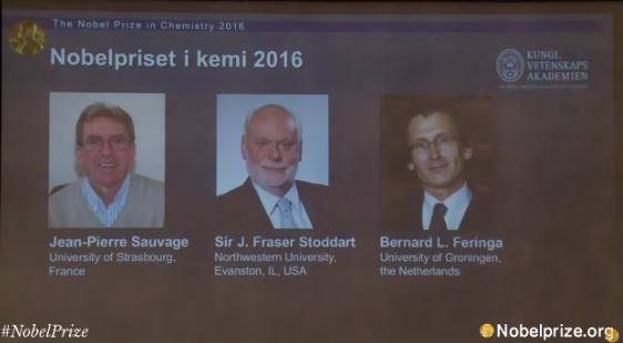 诺贝尔奖官方消息,Jean-Pierre Sauvage, Sir J. Fraser Stoddart 和Bernard L. Feringa获得了今年的诺贝尔化学奖学奖,他们分别来自法国、美国、荷兰。获奖原因为“分子机器的设计和合成”。