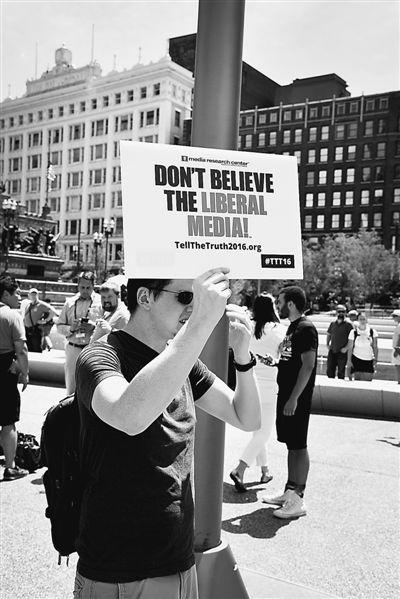 美国民众在克利夫兰街头,高举标语抗议带有偏见的媒体。
