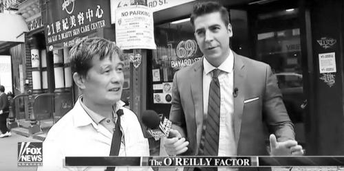 图说:福克斯电视台主持人沃特斯在纽约唐人街采访华人。