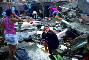 截至7日,强飓风“马修”在海地南部和西北部造成的死亡人数已超过877人。图为受灾的海地居民在倒塌的房屋前。与此同时,“马修”7日抵达美国佛罗里达州并一路北上,佛州已有至少4人死亡,全州有逾100万户停电。