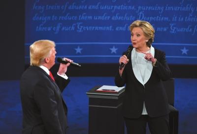 特朗普(左)和希拉里·克林顿在美国总统候选人第二场电视辩论中。新华社发
