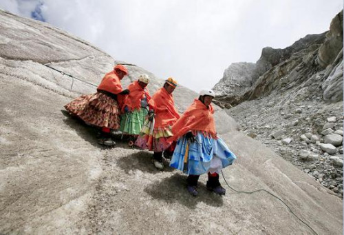 这群“女背夫”在登山时也穿着艾马拉人传统的彩色长裙。不过为了安全起见,她们会摘下圆顶帽,换上专业的登山头盔、护目镜、钉鞋,腰上也会系安全绳。
