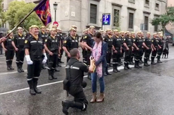 【环球网综合报道】据英国《每日邮报》10月15日报道,近日,在西班牙国庆典礼当天,一名军官向其女友求婚,浪漫甜蜜的画面令人感动。