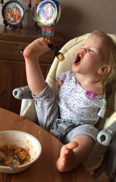 视频中,灵活的小瓦西里娜先用脚趾夹住叉子,把叉子上的土豆往嘴里送。但是第一次失败了,没够到。小瓦西里娜没有气馁,机灵的她调整了土豆和叉子的位置,试了第二次。这一次,她轻而易举地吃到了美美的土豆。