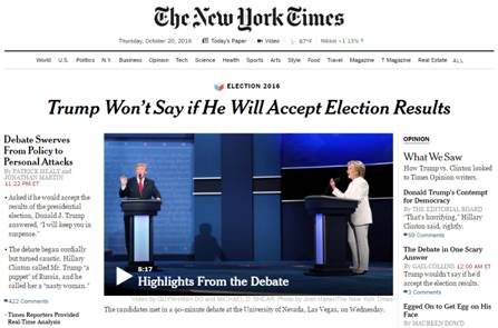 《纽约时报》头条:特朗普拒绝对是否接受选举结果表态。