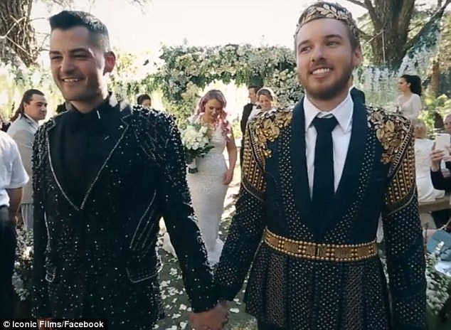 10月15日,澳大利亚男子乔治 艾斯沙(George Elsissa)和米切尔 唐顿(Mitchell Taunton)在该国蓝山举行了奢华的婚礼仪式,结为连理。婚礼上,米切尔头戴黄金叶状头冠,身着点缀黄金叶的同款罗马风格外套,格外引人注目。