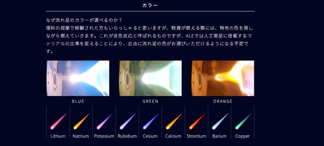 在ALE公司官网上,这项计划被称为“SkyCanvas”。由于ALE公司定义自身为未来太空娱乐领域,人造流星被设计成单粒或流星雨的模组,并加入锂(lithium)、钠(natrium)、钙(calcium)等元素让流星呈现粉红、金、紫等9种颜色。