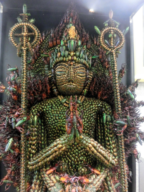 国际在线专稿:据日本《朝日新闻》10月26日报道,日本群马县板仓町的中央公民馆展出了一尊由独角仙、锹形甲虫、金龟子和蝉等昆虫做成的“昆虫千手观音像”,吸引了众多游客前去参观。