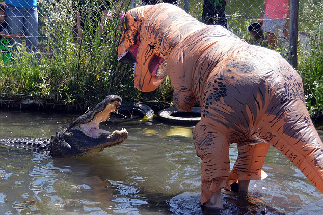 【环球网综合报道】据英国《每日邮报》10月26日报道,在美国科罗拉多州的鳄鱼爬行动物园,一名男管理员把自己打扮成“霸王龙”,手里还拿着一条鱼戏弄水中大鳄鱼,好在这条名为莫里斯(Morris)的鳄鱼经过训练,未对该男子造成伤害。