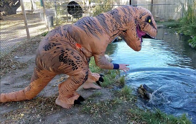【环球网综合报道】据英国《每日邮报》10月26日报道,在美国科罗拉多州的鳄鱼爬行动物园,一名男管理员把自己打扮成“霸王龙”,手里还拿着一条鱼戏弄水中大鳄鱼,好在这条名为莫里斯(Morris)的鳄鱼经过训练,未对该男子造成伤害。