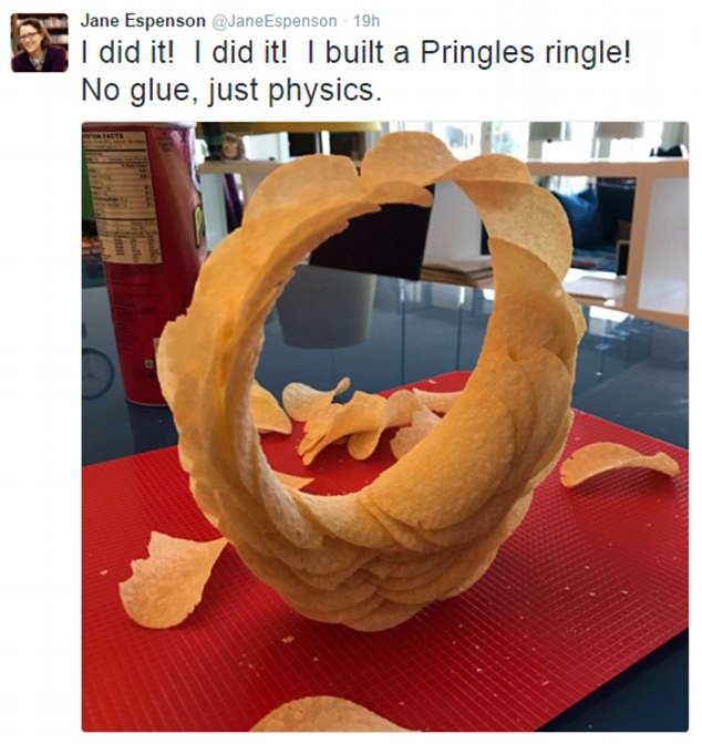 【环球网综合报道】据英国《每日邮报》10月25日报道,近日,网络上一张图片被网友们转发了5万多次。据悉,这张图片由居住在美国洛杉矶的电视编剧珍妮·埃斯彭逊(Jane Espenson)拍摄,内容为她用品客薯片搭建的一个小圆环。