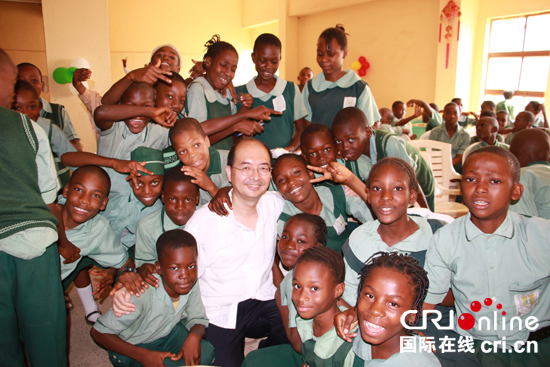 中国驻尼日利亚大使馆文化参赞严向东与尼日利亚中小学生合影 (摄影:徐璟).