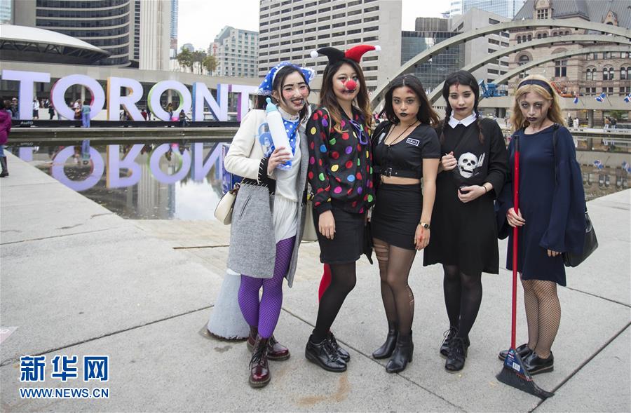 10月29日,在加拿大多伦多,参加“僵尸”游行的狂欢者在活动中合影。新华社发(邹峥摄)