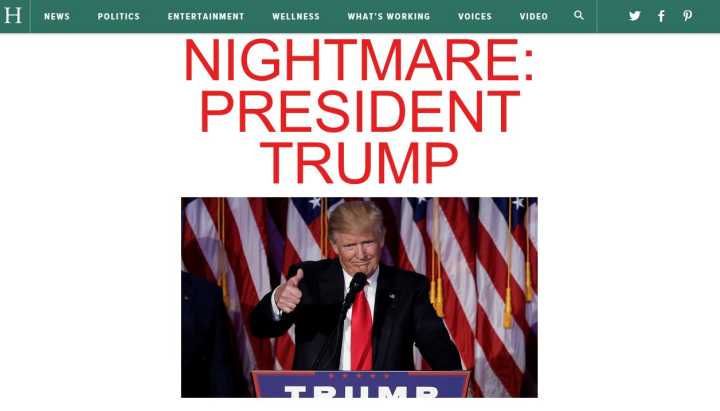 北京时间11月9日,特朗普赢得2016年美国总统选举。虽然特朗普的参选在一年前曾被视作笑料,但本次选情地图竟令人“大跌眼镜”般多地飘“红”,特朗普更是早于希拉里得到270张选举人票。不出意外,在大选结果愈发明朗之际,已有希拉里支持者沮丧大哭,随后,美国多地甚至爆发示威以抗议特朗普当选。在多数美媒还在报道选情结果时,美国《赫芬顿邮报》就在网站首页首屏以《噩梦:特朗普总统》为题,来评论美国这一“难以想象”的选举结果。