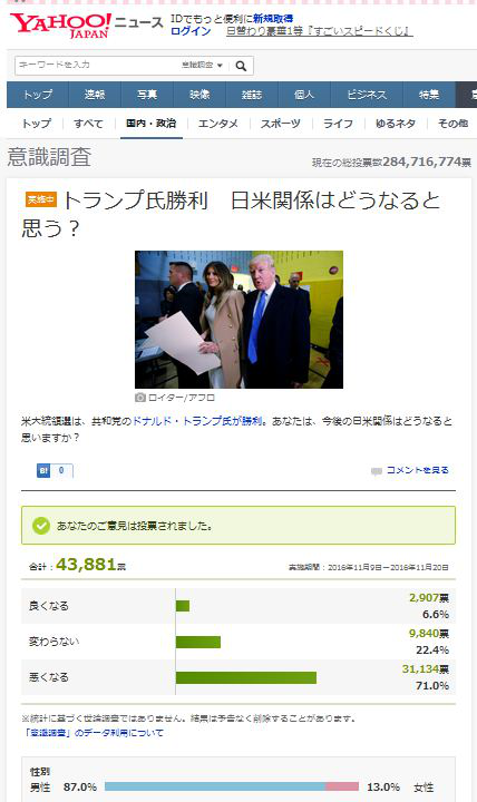据日本雅虎新闻网在美国大选当天晚间进行调查,四万多名受调查者中,有71%的人认为川普上台会造成日美关系恶化,而认为他会改善日美关系的,只占6.6%