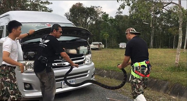 据悉,当时校车停在曼谷的一座公园内。路人撞见了这条眼镜蛇,并看见它缓缓地爬进了校车的发动机里。校车内,司机坤·维特哈雅(Khun Witthaya)正准备载着12名学生去上学。他说:“当有人告诉我发动机里有蛇时,我整个人都震惊了。因为这是我第一次遇到这种情况。于是,我第一个下了车,让学生们跟在我后面。他们知情后,反而觉得很有趣。”