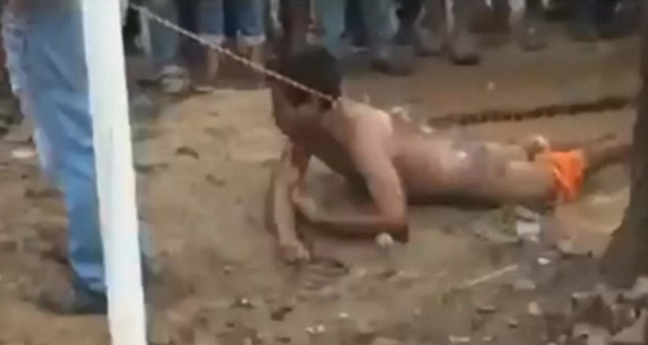 在玻利维亚北部,一男子因强奸杀害一四岁女童而被捕,被押送至警局后,愤怒的人群拒绝等待对他的审判,直接将他从警察局拖了出来,绑在树上处以私刑。