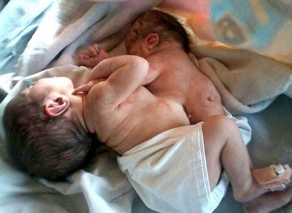 【环球网综合报道】据英国《每日邮报》11月16日报道,近日,印度28岁的妇女赫姆拉塔·辛格(Hemlata Singh)产下了一对“寄生双胞胎”:其中一个男婴发育完全,而另一个只有上半身的男婴则长在他的胸上,两人共用一个肝脏和体内的大部分血液。