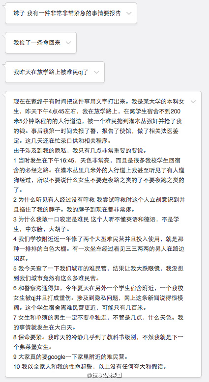 中国驻德国杜塞尔多夫总领事馆11月18日通报说,接到一名中国女留学生报告,称其在返回宿舍途中遭性侵。德国警方已经接到报案并开展调查。图为疑似受害人微博求助信息(来自“这就是德国”)