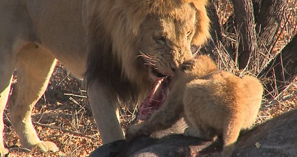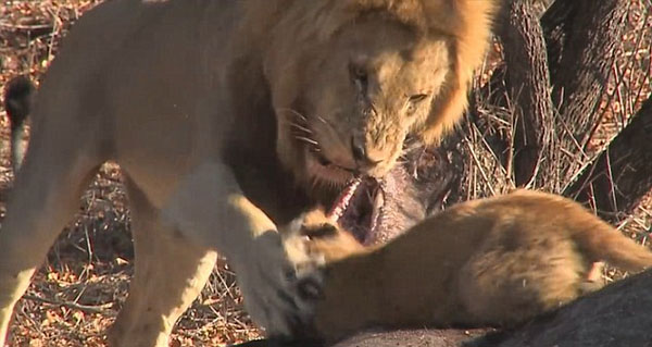 当其它小狮子正安心地在尸体尾部享受美食时,这只企图与父亲抢食的小狮子却被一把揪住狠摔在地。就在它迅速爬起,再次靠近食物时,父亲伸手便按住这个放肆的小家伙的脑袋不让它靠近。小狮子痛苦地低吼几声后不得不乖乖等在旁边,等待轮到自己进食。
