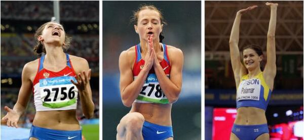 当年成绩排在洛之前的三位女运动员——左起:俄罗斯运动员安娜·奇切罗娃、叶连娜·斯列萨连科和乌克兰运动员维塔·帕拉马尔——因兴奋剂问题被取消奖牌资格。(图片来源:美国《纽约时报》网站)