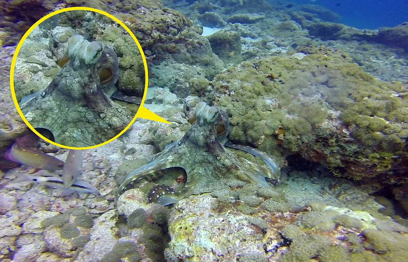 章鱼潜伏在珊瑚中,几不可见,恩达慢慢接近它后,揭开了它的伪装。只见它伸展躯体伏在礁石上,形态和颜色严丝合缝地与海床背景融合,细节完美无缺,眨眼之间便销声匿迹。