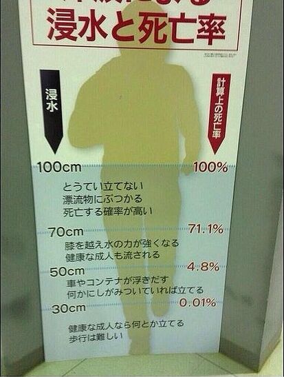【环球网综合报道】据日本livedoor新闻网11月22日报道,伴随日本福岛县22日发生地震并引发海啸,社交网站上面的一张展示板图片引起了广泛关注。这张图上写着“浸水100厘米(1米)预计死亡率为100%”、“难以站立 被漂浮物撞击 死亡几率高”等。