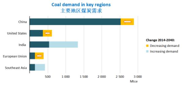 煤炭行业的未来处境可谓“雪上加霜”,主要地区煤炭需求不断回落。IEA指出,中国的能源转型是影响全球大势的关键所在,煤炭消费达峰标志着煤炭行业的转折点。未来煤炭需求将大幅回落,IEA预计2040年中国煤炭需求仅为2500百万吨标准煤。为了控制空气污染,减少碳排放,电力和天然气将填补煤炭需求减少的空间,其中,天然气的使用量将在21世纪30年代超过煤炭。