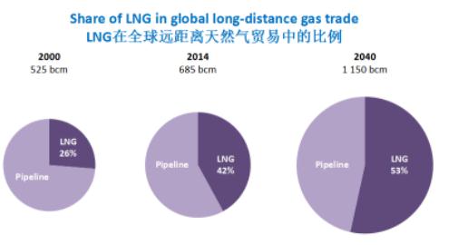 从天然气领域来看,液化天然气(LNG)推动了又一次天然气革命。Tim Gloud介绍,当前,天然气市场转型不断加深,LNG在全球远距离天然气贸易中的占比也不断提高,到2040年这一比例将达到53%。考虑到当前LNG市场供应已经充足,澳大利亚、美国及其他新LNG出口国的加入将给相关合同条款和价格机制带来挑战。