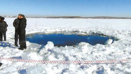 俄车里雅宾斯克州切巴尔库尔湖上的一处冰洞,被疑为陨石坠落点。新华社发