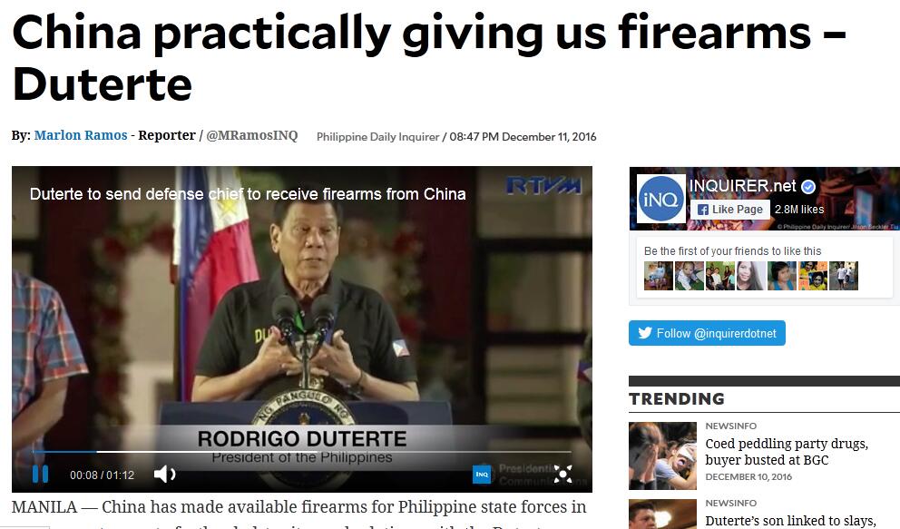 【环球网报道 记者 余鹏飞】菲律宾《每日问讯者报》报道称,菲总统杜特尔特11日称,中国将向菲律宾军队提供武器,他已经指示国防部长德芬·洛伦扎纳派出一名将军前往北京接收这批枪支装备。
