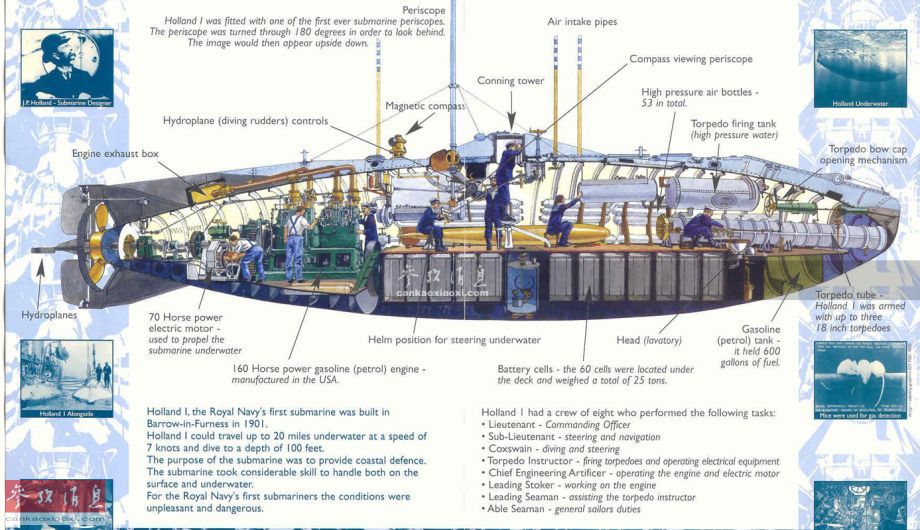 图为英国海军历史上第一艘潜艇“霍兰一号”,由潜艇之父——约翰·菲利普·霍兰所设计,该艇于1901年投入服役。