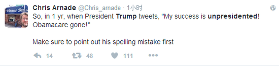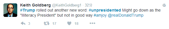 网友Keith Goldberg:特朗普又整出了一个新词儿——很不总统(unpresidented)。这可能让这个“文盲总统”留名史册,但真不是个好办法。