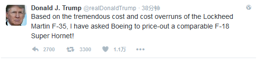 “基于洛马公司的F-35价格过于昂贵以及预算严重超支的原因,我和波音谈了,给我一个可与F-35‘匹敌’的F-18超级大黄蜂的报价。”