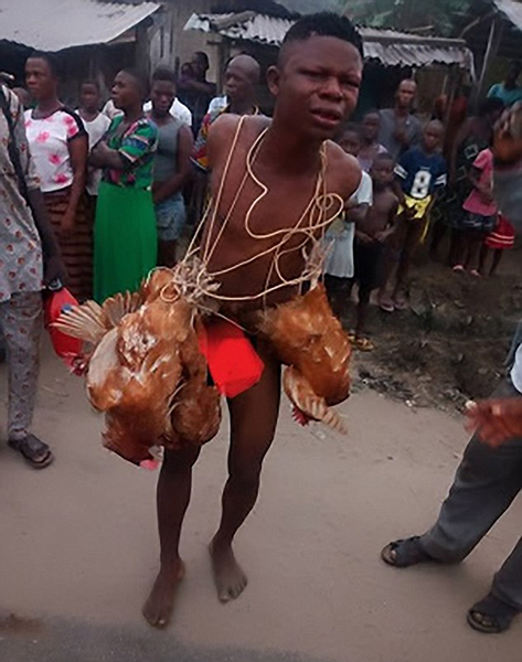 【环球网综合报道】据英国《每日邮报》12月28日报道,近日,在尼日利亚拉各斯州的伊科罗杜(Ikorodu),一名偷鸡的男子遭到当地人毒打,并被扒光衣服,在脖子上挂上三只鸡后,强行拉到大街上游行。