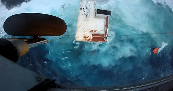 这则视频里的大胆救援堪比好莱坞电影中的场景。视频显示,在货船搁浅后,一架希腊海军直升机悬停在海面上空。船员在搁浅的上甲板上等待救援时,一条绳索从直升机上投下。