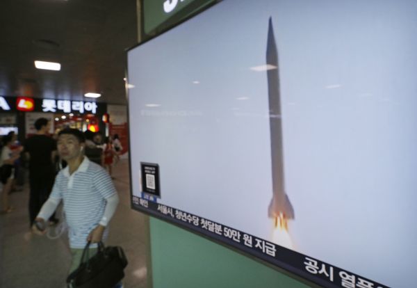 资料图片: 2016年8月3日,在韩国首尔火车站,一名男子经过播放朝鲜发射导弹资料画面的显示屏。 韩国军队联合参谋本部3日称,朝鲜当天早晨向朝鲜半岛东部海域发射1枚弹道导弹。 新华社/美联