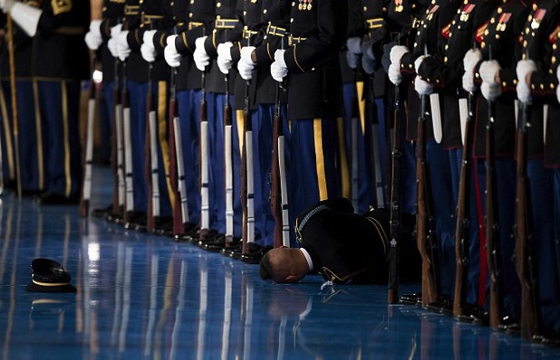 奥巴马任内最后一次检阅美军遇尴尬 仪仗兵晕倒(图)