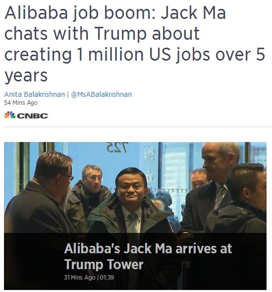 起初,CNBC援引消息人士的话称,马云此次会见特朗普,主要是聊阿里巴巴最新的美国扩张计划。这份计划包括未来5年在美国创造100万就业岗位。CNBC显然对此充满期待,并将这个点当做标题。