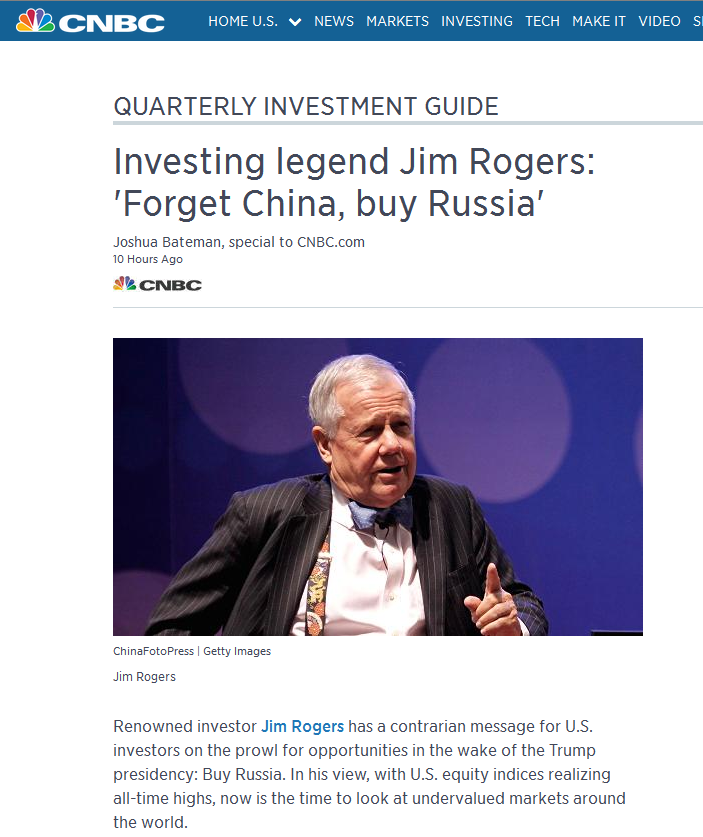 【环球网报道 记者 谭福榕】“忘掉中国,买俄罗斯吧!”这是美国CNBC关于美国投资大鳄吉姆·罗杰斯最新论断的报道。罗杰斯在采访中对特朗普时代的美俄关系回暖以及由此带来的商机表示了乐观,与此同时,他对特朗普的对华政策表达出担忧。尽管CNBC的标题很耸动,罗杰斯却非常清晰地传递出一个讯息:世界经济的动力在亚洲,有些美国人还不明白。