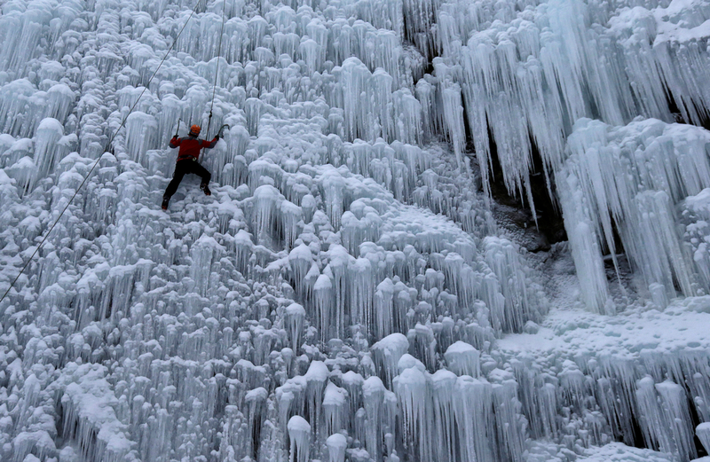 当地时间2017年1月12日,捷克利贝雷茨,一名男子爬上人工冰墙。