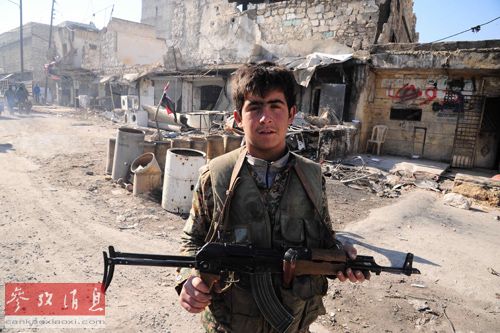 一名叙利亚士兵站在阿勒颇东部的废弃居民区前(摄影 阿马尔)