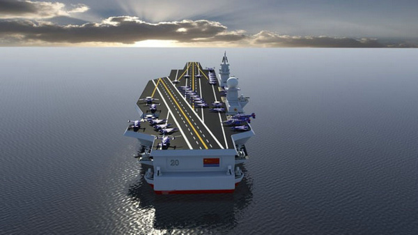 据美媒报道,在中国首艘国产航母之后,解放军将迎来003型核动力航母。报道称,003型航母本身排水量约为9万吨至10万吨,搭载70至100架直升机和固定翼飞机,并具有多个飞机升降舵和一个超级舰岛。报道还指出,水下护航方面,护航潜艇可能是095型攻击型核潜艇。资料图:中国核航母想象图。