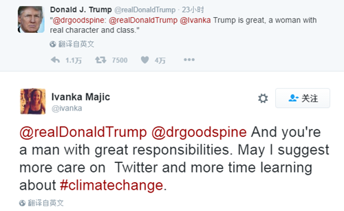 针对特朗普的“艾特(@)”,伊万卡·马吉克回复到:“@特朗普 您是一位肩负着很大责任的人,我建议您发推的时候还是小心点儿,而且多花些时间去关注一下全球气候变化吧。”