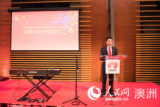 中国驻阿德莱德代总领事梅运才向来宾们致以新春的问候和良好祝福。他在致辞中表示,春节不仅仅是中国人民的重要传统节日,也日益受到澳大利亚人民的喜爱。这是总领馆设立后举办的第一次春节招待会,具有特别意义的是,南澳州政府与总领馆联合主办这次活动,体现了南澳州政府重视对华关系、尊重中华传统文化以及对总领馆工作的大力支持。春节是阖家团聚的日子,也是回顾展望的日子。回首2016年,中澳关系取得丰硕成果。中澳自贸协定生效一年多来,中澳务实合作达到前所未有的水平,双方贸易额大幅增长,为两国带来了互利双赢,也有力地推动了两国人文交流与合作。