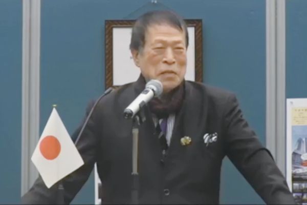 图为APA 酒店社长元谷外志雄讲话的视频截图。