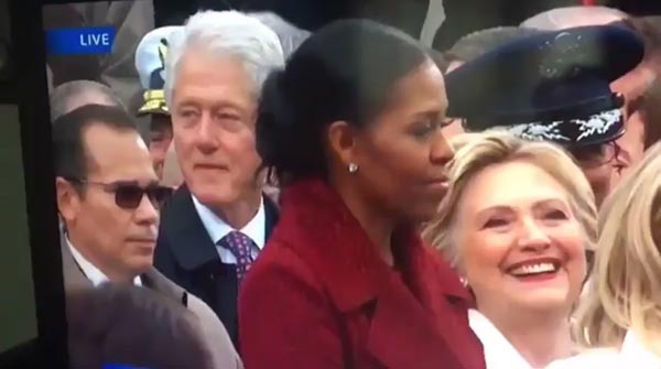 当地时间2017年1月20日,据英国媒体消息,美国前总统克林顿在特朗普就职典礼上疑似偷瞄特朗普女儿伊万卡,遭到妻子希拉里的怒视。